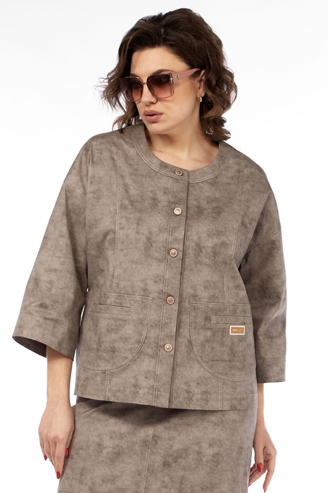Жакет прямого силуэта, с центральной бортовой застежкой на петли и джинсовые пуговицы. Горловина округлой формы с отрезной обтачкой. По переду обработаны рельефы и накладные детали фигурной формы, в которых выполнены карманы. На спинке обработаны рельефы и кокетка. Рукава спущенные, с широкой подгибкой низа. Изделие дополнено по спинке дизайнерской вышивкой.
