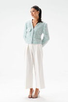 Жакет с широким плечевым поясом и спущенными рукавами — идеальное сочетание структурированной элегантности и современного кроя. Модель с защипами по талии подчеркивает силуэт, добавляя женственности, а широкий плечевой пояс создает эффектный объем, напоминающий ретро-стиль 80-х. Спущенные рукава придают образу расслабленную ноту, сохраняя при этом аккуратную форму.