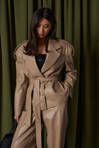Модель силуэта оверсайз, с длинным свободным рукавом покроя реглан. Воротник отложной. Застежка центральная на молнию с дополнительной планкой. По полочке расположены прорезные карманы с клапаном. Рукав длинный, на притачной манжете с застежкой на пуговицу. Спинка с центральным швом, по низу заложены складки. По низу изделия, спереди расположен декоративный пояс с пряжкой для более комфортного прилегания. Модель на шелковой подкладке.