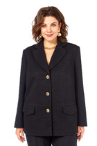 Двубортный жакет умеренного объема, полуприлегающего силуэта. Нагрудные вытачки на полочках расположены вертикально и совмещены с талиевыми, заканчиваются входом в карман. Карманы прорезные, в рамку с клапаном. Спинка имеет плечевые вытачки, средний шов со шлицей. Рукава двухшовные, длинные. Воротник – стойка переходит в край борта, имеющий V-образную форму. Застежка на прорезные петли и пуговицы. Жакет полностью обработан притачной подкладкой. Длина изделия до середины бедра. Длина по спинке 71 см, длина рукава 61 см.