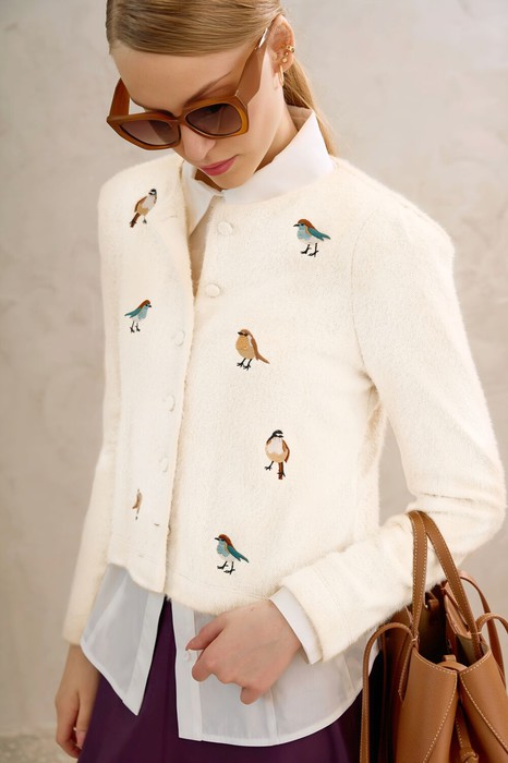 Жакет прямого силуэта и выполнен из нежного трикотажного полотна. Рукав втачной длинный, по верхней части рукава встречная складка. Округлый вырез горловины. Застежка на петли и пуговицы, по переду жакета выполнена вышивка – птички.