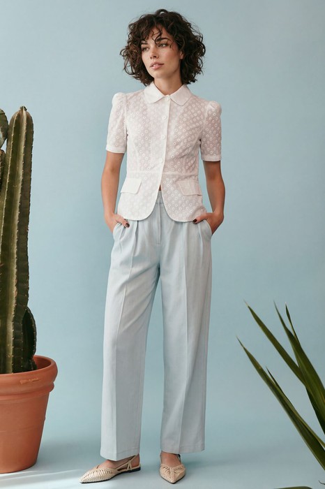 Жакет выполнен из хлопковой ткани ришелье, без подкладки. Рукав короткий со сборкой по окату. Классический рубашечный воротник на стойке, застёжка центральная на петли и пуговицы. По переду вертикальные рельефы, линия талии отрезная с притачной баской, которая мягко раскрывается к низу, создавая баланс между структурой и легкостью. По баске декоративные клапаны по бокам. По спинке: средний шов, рельефы и баска.