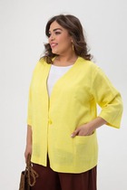 Жакет прямого силуэта с фигурным низом из трикотажного полотна. Горловина округлая, по центру застежка на кнопки. Рукав со спущенной линией плеча. По переду накладные карманы. Жакет без подкладки. Обращаем ваше внимание, что фурнитура может отличаться от фото.