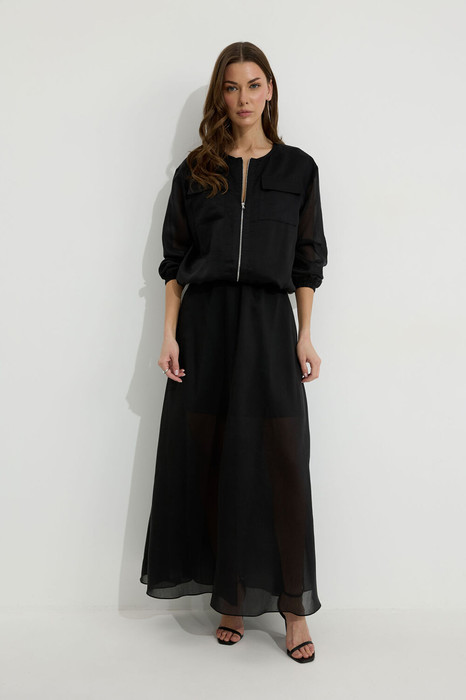Бомбер из вискозной полупрозрачной ткани. Свободного, расширенного силуэта, со спущенной линией плеча. Горловина овальной формы. По нижнему срезу изделия по переду и спинке складки и небольшая сборка на резинку. По переду отрезные планки,  застежка на металлическую молнию. На уровне линии груди накладные карманы с клапанами. Рукав длинный, по нижнему срезу с резинкой. Перед и спинка изделия на подкладке из основной ткани. Обращаем Ваше внимание, что фурнитура может незначительно отличаться от фото.