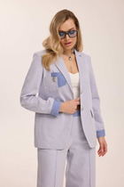 Жакет двубортный прямого силуэта . Спинка со средним швом. Перед с рельефами, переходящими в карман. Рукав реглан, длинный, снизу рукава шлевки, в которые продета пата с застежкой на две обтяжные пуговицы. Застежка жакета на обтяжные пуговицы и пояс с обтяжной пряжкой. На груди - косые прорезные карманы с листочкой.