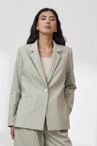 Жакет двубортный прямого силуэта свободного объёма. Изделие на подкладке. Линия плеча немного расширена. Боковой шов отсутствует, смоделирован бочок. Детали переда с двумя вытачками. Первая вытачка из горловины переда располагается под лацканом. Вторая вытачка образована за счет объединения нагрудной вытачки с талиевой. Деталь правого переда с двумя прорезными карманами с клапаном, которые располагаются один над другим. Вытачка заканчивается подрезом по линии входа нижнего кармана. На детали левого переда вытачка переведена в линию низа, заканчивается разрезом. В рельефный шов на уровне талии вставлен пояс с петлей. Рукав втачной двухшовный. Воротник английский с отрезной стойкой.