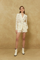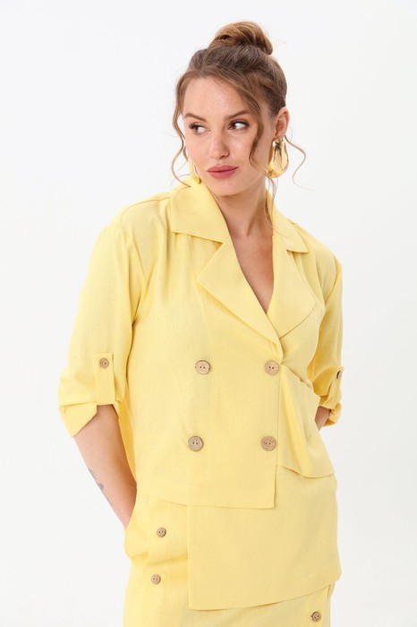 Жакет прямого силуэта с имитацией центральной застёжки на пуговицы. Рукав втачной одношовный, длиной три четверти,застегивающийся на пату. Воротник пиджачного типа . Линия низа фигурная, симметричная . По левому переду расположена декоративная деталь.