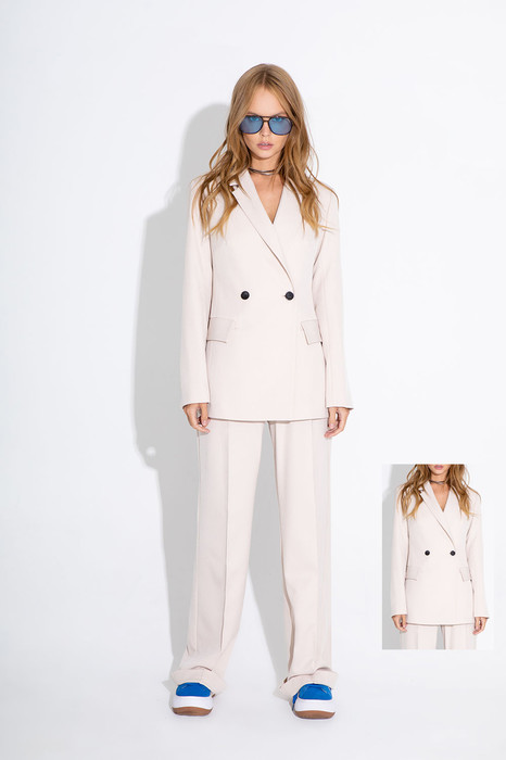 Классический приталенный жакет из текстильной ткани. Детали: жакет с отрезными бочками и нагрудными вытачками, пиджачный воротник, прорезные карманы, двубортная застежка на петли и пуговицы, спинка со средним швом, втачные двухшовные рукава, жакет на подкладке