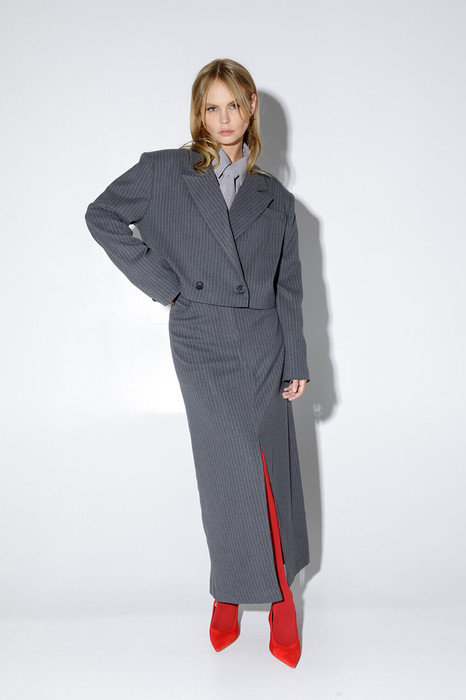 Укороченный оверсайз жакет с расширенными плечами. Детали: прямой силуэт, спущенная линия плеча, пиджачный воротник, перед с функциональным нагрудным карманом, застежка двубортная на петли и пуговицы, рукава втачные двухшовные, жакет на подкладке.