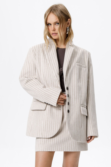 Детали: прямой силуэт, расширенная линия плеч, пиджачный воротник, перед с функциональными карманами, однобортная застежка на петли и пуговицы, спинка со средним швом и шлицей, рукава втачные двухшовные, жакет на подкладке.