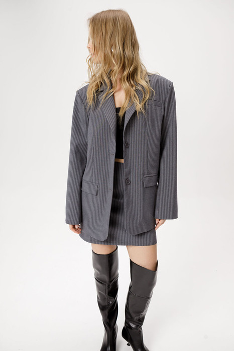 Оверсайз жакет из текстильной ткани в тонкую полоску со стразами.