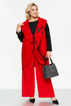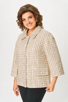 Модель полуприлегающего силуэта, с рельефами, на подкладе. Застёжка двубортная на петли и пуговицы. Спереди прорезные карманы в рамку, а также имитация кармана и декоративные пуговицы. Спинка со средним швом. Воротник пиджачный. По низу рукава обработана шлица с отделочными петлями и пуговицами.