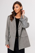 Стильный жакет полуприлегающего силуэта, выполнен из полушерсти. Воротник пиджачного типа с отложными лацканами. Застежка центральная на петли и пуговицы. Спереди обработаны накладные карманы, в области груди подрезы с нагрудными вытачками. Спинка с рельефами и средним швом, переходящим в шлицу. Рукава втачные двухшовные, на левом рукаве декоративная нашивка. Изделие на подкладке.
