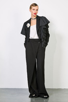 Жакет полуприлегающего силуэта, длиной ниже линии бедер. Спинка со средним швом, в котором обработана шлица, с рельефами от пройм до низа. Перед с нагрудной вытачкой, рельефом и прорезным карманом «в рамку». Рукава двушовные, втачные, длинные. Воротник пиджачного типа с лацканом. Застежка на петлю и пуговицу. Жакет по левому лацкану и рукавам дополнен съемным декором с цепочками. Жакет на подкладке.
