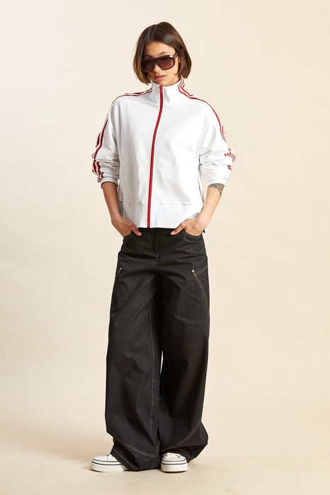 - вдоль рукавов, линии плеча и через воротник проходят широкие лампасы с печатными полосками.