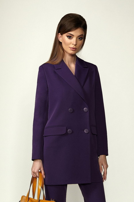 Жакет из костюмной ткани на подкладке. Жакет прямого силуэта с двубортной застежкой на 2 петли и пуговицы и одну потайную. По переду- прорезные карманы с клапанами. Воротник-с отложными лацканами пиджачного типа, двухшовные, длинные. Спинка-без швов.