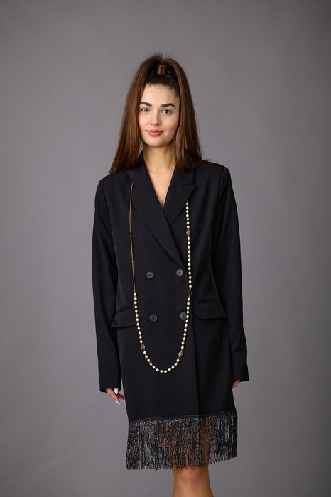 Представляем жакет женский из костюмной ткани на подкладке,который станет незаменимым спутником в вашей жизни. Лаконичный прямой силуэт жакета с двубортной застежкой прекрасно сочетается с бахромой. По переду- прорезные карманы с клапанами. Воротник-с отложными лацканами пиджачного типа. Рукава двухшовные, длинные. Жакет можно носить, как самостоятельно, так и в сочетании с платьями- комбинациями, юбками, брюками. Длина жакета 44-48р - 82см +10см бахрома, 50-54р- 84см+10см бахрома
