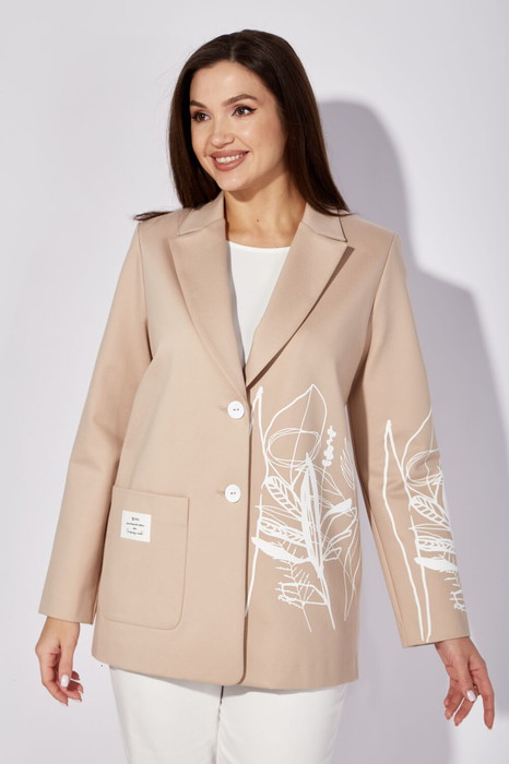 Жакет женский, облегченный, выполнен из трикотажного полотна, без подкладки, прямого силуэта с длинным втачным рукавом. Воротник пиджачного типа с лацканами. Застежка однобортная на петли и пуговицы. Левая полочка и рукав акцентированы ярким принтом. На правой полочке накладной карман с декоративной нашивкой. Спинка со средним швом.
