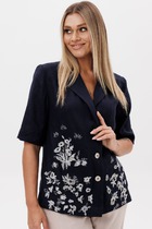 Жакет женский, облегченный, выполнен из трикотажного полотна, без подкладки, прямого силуэта с длинным втачным рукавом. Воротник пиджачного типа с лацканами. Застежка однобортная на петли и пуговицы. Левая полочка и рукав акцентированы ярким принтом. На правой полочке накладной карман с декоративной нашивкой. Спинка со средним швом.