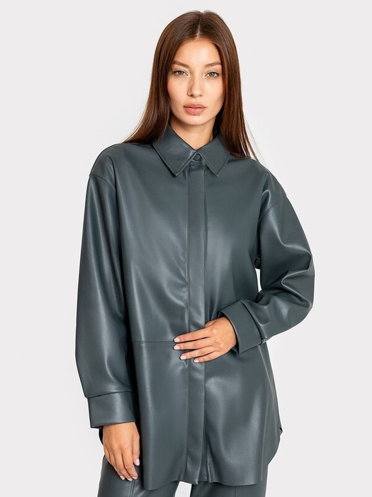 Жакет женский свободного силуэта из полотна под "кожу". Горловина круглой формы с втачаным воротником. На детали переда центральная застежка на кнопки. Планка отрезная.