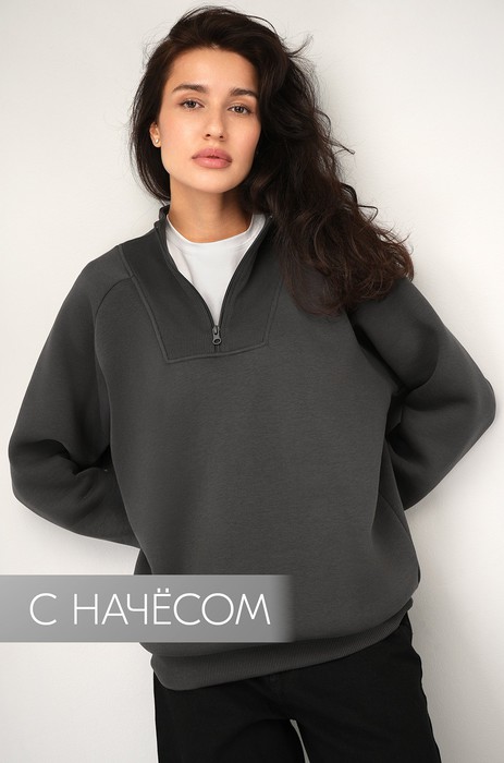 Женская толстовка оверсайз — стиль и комфорт в одном. Однотонный темно-серый свитшот на молнии выполнен из мягкого футера с начесом (60% хлопок, 40% полиэстер). Спортивная кофта с воротником на молнии согреет в прохладные дни.