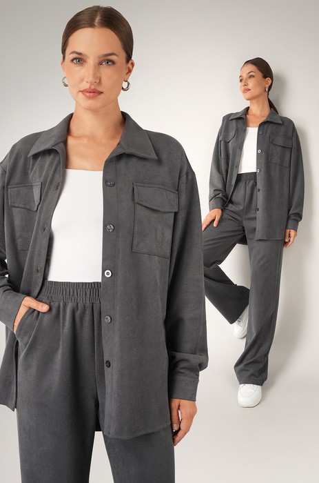 Брюки палаццо на резинке и рубашка оверсайз с нагрудными карманами создают женский комплект, который одинаково уместен для девушек и женщин и в офисе, и на прогулке. Темно-серый вельветовый костюм будет незаменим как базовый, даря комфорт в осенний или весенний сезон.