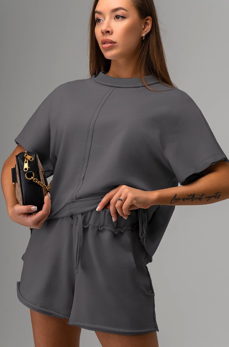 Женский спортивный костюм с шортами выполнен 100% хлопка. Костюм графитового цвета станет идеальным дополнением для активного отдыха или уютного домашнего времяпрепровождения.