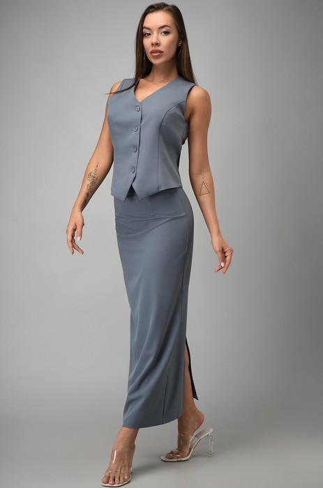 Приталенная жилетка имеет застёжку на пуговицы. Длинная юбка с разрезом сзади добавляет изысканности. Жилет дополнен подкладкой, что делает посадку ещё более точной и комфортной. Скрытая молния на юбке аккуратно завершает образ.