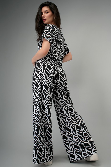 Женский костюм с брюками точно не оставит без внимания — черно-белый контрастный рисунок притягивает взгляды. Летний брючный костюм подарит комфорт.