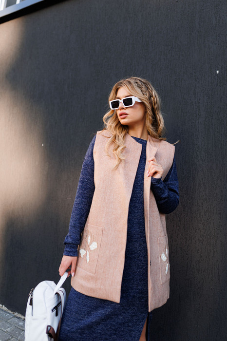 И теплая,  и красивая, и комфортная ! Невероятное сочетание качеств создано для Вашего удовольствия. Жилетка с шерстяными волокнами, на утепленной подкладке, с дизайнерской вышивкой- аппликацией на карманах. Застежка по переду на кнопки.