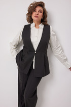 Жилет прямого свободного кроя выполнен из текстильного полотна черного цвета. Характеристики: прямой свободный крой,брендированная подкладка, застежки центральные на петли - пуговицы, декоративный карман. Длина по спинке 41см.