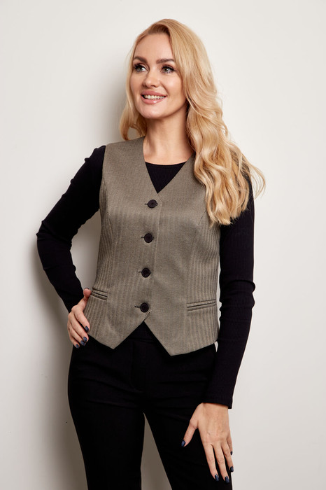 Жилет женский на подкладке из тёплой ткани, с застёжкой спереди на петли и пуговицы, с вертикальными рельефами по перпеду и спинке, с карманами -" обманками" по переду, с хлястиком по спинке.