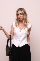 Жилет женский прямого силуэта. Перед с отрезным бочком и талиевыми вытачками.По переду обработаны прорезные карманы с клапаном. Спинка  со средним швом и рельефами от проймы. Горловина с воротником пиджачного типа и отложным лацканом. Застежка однобортная на петли-пуговицы. Жилет на подкладке. Длина по спинке 85 см.