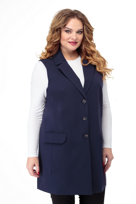 Жилет женский прямого силуэта. Перед с отрезным бочком и талиевыми вытачками. По переду обработаны прорезные карманы с клапаном. Спинка со средним швом и рельефами от проймы. Горловина с воротником пиджачного типа и отложным лацканом. Застежка однобортная на петли-пуговицы. Жилет на подкладке. Длина по спинке 85 см
