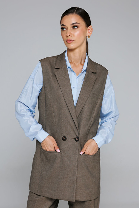 Жилет полуприлегающего силуэта, без рукавов. Полочка с бочком и рельефом, воротник отложной с лацканом, с застежкой на петлю-пуговицу. Карман в рамку. Спинка со средним швом заканчивающимся шлицей и рельефами. Жилет на подкладке.