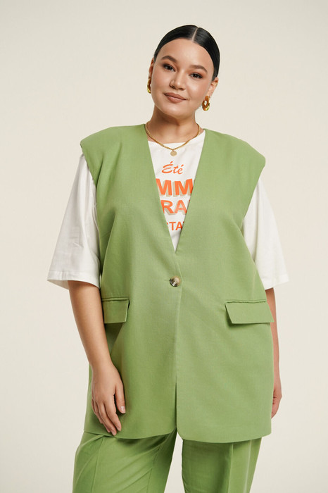 Жилет женский на подкладке, полуприлегающего силуэта, с расширенной линией плеча и подплечниками. Вырез V-образный, застежка на петлю и пуговицу. По переду прорезные карманы с клапанами. По спинке шлица.