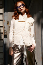 Жилет выполнен из матовой плащевой ткани, простеганной с изософтом. Жилет прямого силуэта, длиной миди. Спереди застежка на молнию и кнопки на планке. Карманы прорезные, застегивающиеся на молнию. Спинка со средним швом. Воротник-стойка. Капюшон съемный, крепится на пуговицы. В комплект входит съемный ремень из широкой эластичной тесьмы с пряжкой-карабином. Жилет на притачной по низу подкладке.