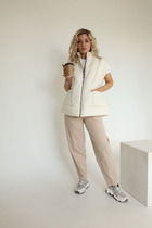 Жилет выполнен  из матовой плащевой ткани, простеганной с изософтом. Жилет прямого силуэта, длиной миди. Спереди застежка на молнию и кнопки на планке. Карманы прорезные, застегивающиеся на молнию. Спинка со средним швом. Воротник-стойка. Капюшон съемный, крепится на пуговицы.  В комплект входит съемный ремень из широкой эластичной тесьмы с пряжкой-карабином. Жилет на притачной по низу подкладке.