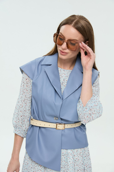 Жилет из экокожи прямого силуэта с воротником пиджачного типа. По правой пройме переда расположена фигурная деталь "крылышко". Спинка со средним швом. По низу правого переда и низу правой спинки фигурная деталь. По левой части переда и левой части спинки отлетная кокетка. Изделие идёт в комплекте с ремнем из экокожи.