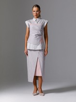 Жилет двубортный с отложным воротником на отрезной стойке, умеренного объема, прямого силуэта с застежкой на петли и пуговицы. Талия фиксируется съемным ремнем из экокожи, для которого в боковых швах оформлены шлевки. Ремень идёт в комплекте к изделию.