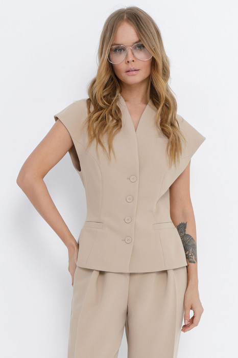 Детали: полуприлегающий силуэт, цельнокроеный воротник-стойка, рельефные швы переда и спинки, функциональные карманы, застежка на петли и пуговицы, жилет на подкладке.