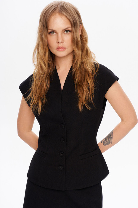 Приталенный жилет с воротником-стойкой из текстильной ткани.