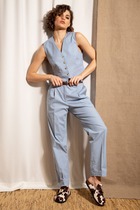 Модель на подкладе, с центальной застёжкой на петли и пуговицы. Вырез горловины V-образный. Спереди наклонные и горизонтальные подрезы, прорезные карманы в рамку. Спинка со средним швом, рельефами и горизонтальными подрезами. Линия низа и край борта фигурные.