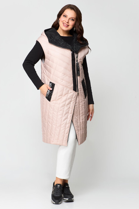Жилет женский прямого силуэта, со спущенной линией плеча, на подкладке. По горловине капюшон. По переду прорезные карманы с листочкой. Спинка в верхней части со швом, по спинке и полочке косые подрезы. Застежка смещенная на молнию. Низ жилета фигурной формы. Отличный вариант жилета для стильных образов!