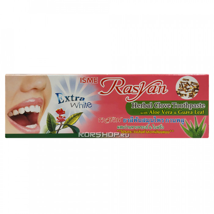 Зубная паста Rasyan с гвоздикой экстрактом листьев гуавы и алое вера – это один из самых популярных в мире тайских продуктов. Известность ей принести натуральный состав, необычайная эффективность и невысокая цена. Паста хорошо вспенивается и расходуется достаточно экономично: на зубную щетку достаточно выдавить совсем маленькую горошину. Она обеспечивает свежее дыхание, устраняет неприятный запах, вызываемый продуктами жизнедеятельности микроорганизмов, а также превосходно отбеливает зубы. Паста не содержит жестких абразивных частичек, поэтому не повреждает тонкую эмаль и не травмирует чувствительные десны. Она мягко и бережно полирует зубы, постепенно удаляя налет от чая, кофе и табака, а также заживляет царапины и останавливает воспалительные процессы в ротовой полости. Купить зубную пасту Rasyan с гвоздикой, экстрактом листьев гуавы и алоэ вера по демократичной цене можно в интернет-магазине азиатских товаров KorShop.ru . Здесь Вы найдете качественную тайскую бытовую химию и сможете заказать пасты, щетки, дезодоранты и массажные бальзамы с доставкой на дом по Москве и Подмосковью.