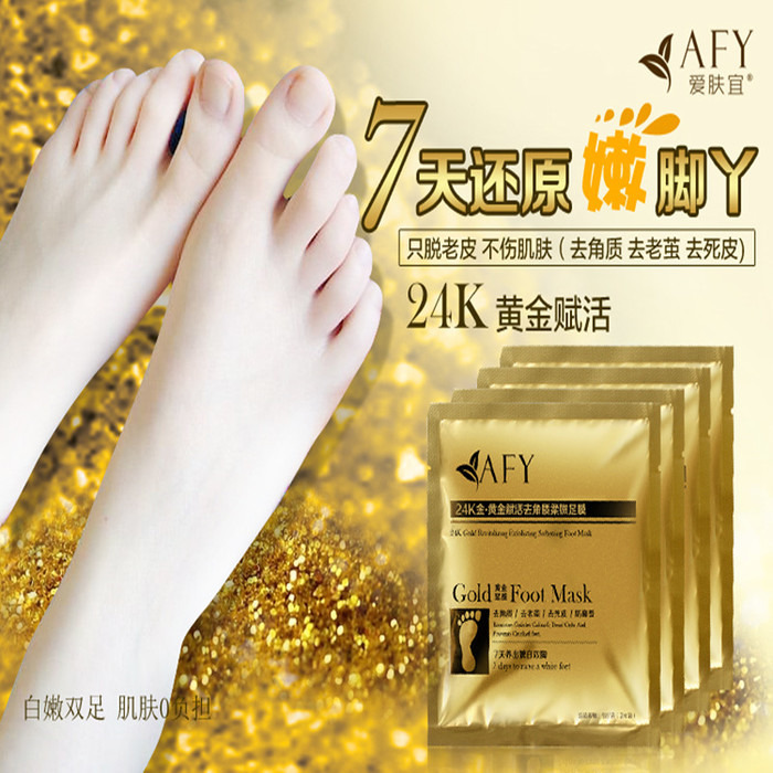 AFY Отшелушивающий пилинг-маска для ног с био-золотом 24K Gold Revitalizing Exfoliating Foot Mask - это инновационный продукт, который сочетает в себе глубокий пилинг стоп и долговременный оздоравливающий эффект. Эффективное средство для удаления мозолей, натоптышей и потрескавшейся кожи на стопах. Маска-носки предотвращает огрубление кожи и образование новых трещин. Гликолевая и цитрусовая кислоты, энзимы папайи способствуют безболезненному и естественному удалению отмерших клеток. Экстракт огурца и глицерин оказывают смягчающее, увлажняющее и восстанавливающее действие. Лавандовое масло успокаивает и дезинфицирует кожу. При использовании маски, содержащиеся в ней частицы биоактивного золота начинают выделять тепловую энергию, благодаря чему высвобождаются отрицательно заряженные ионы. Они глубоко проникают в подкожные слои и, взаимодействуя с положительно заряженными ионами в организме человека, способствуют усилению микроциркуляции крови и активизирует проникновение в кожу других компонентов. Форма маски в виде носков делает процедуру простой и приятной. Уже через 7-10 дней кожа ваших ног станет гладкой и нежной.