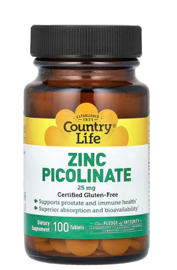 Цинк необходимо употреблять ежедневно, поскольку он не накапливается в организме. Цинк важен для укрепления иммунитета и здоровья простаты. В ходе клинических испытаний с участием людей было обнаружено, что пиколинат цинка обладает лучшей усвояемостью в организме, чем цитрат и глюконат цинка.