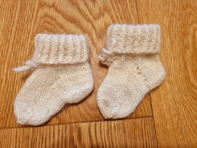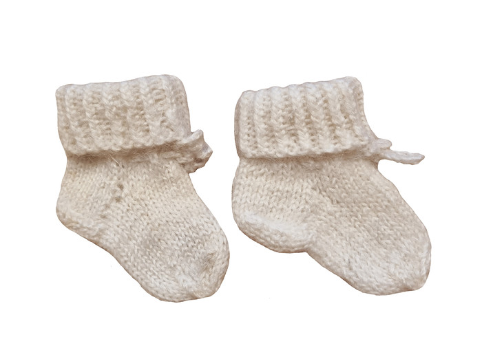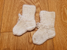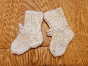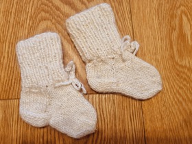 Новые шерстяные вязаные носочки. Отличное решение на зимнее время года. Украшены завязками на шнурке, для дополнительной фиксации. Цвет: белый. Состав: 100% шерсть. Размер 0-6 M, для новорожденного 0-6 месяцев, ростом 50-60.