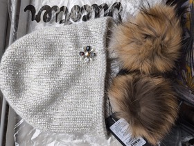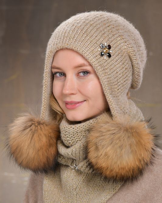 ушанка двухслойная с закрепкой сзади для придания формы изделию, декорирована помнонами из натурального меха и ювелирной брошью